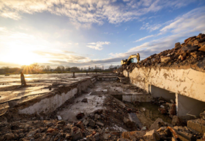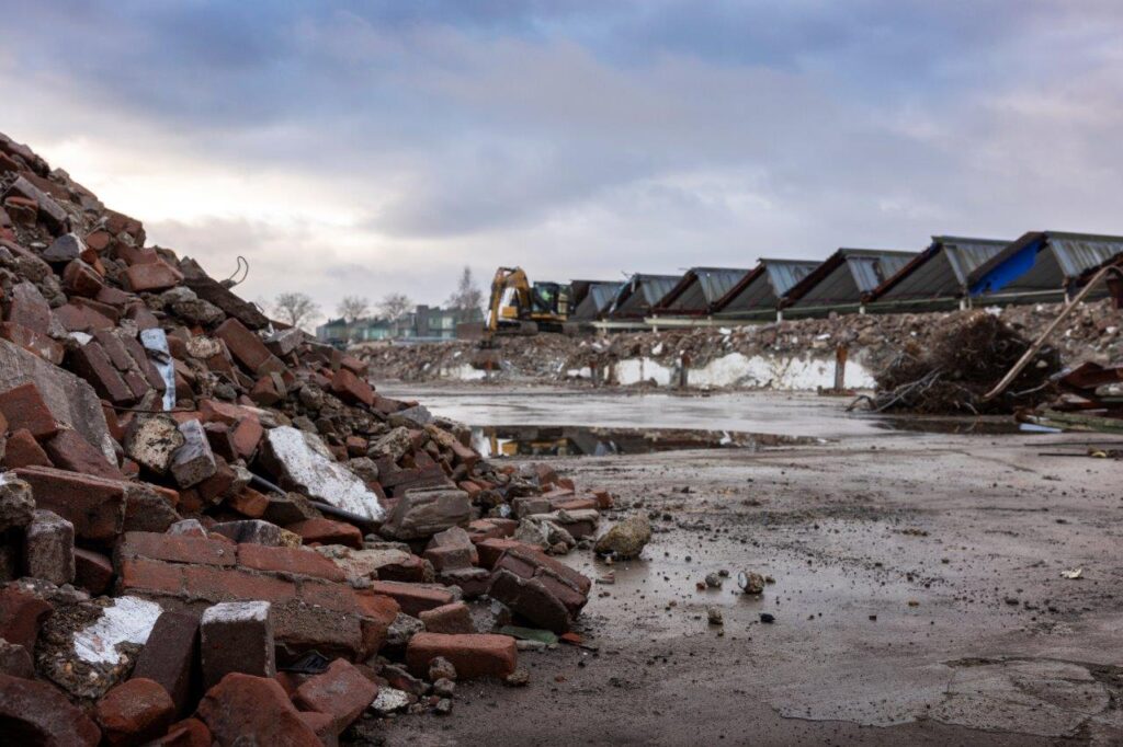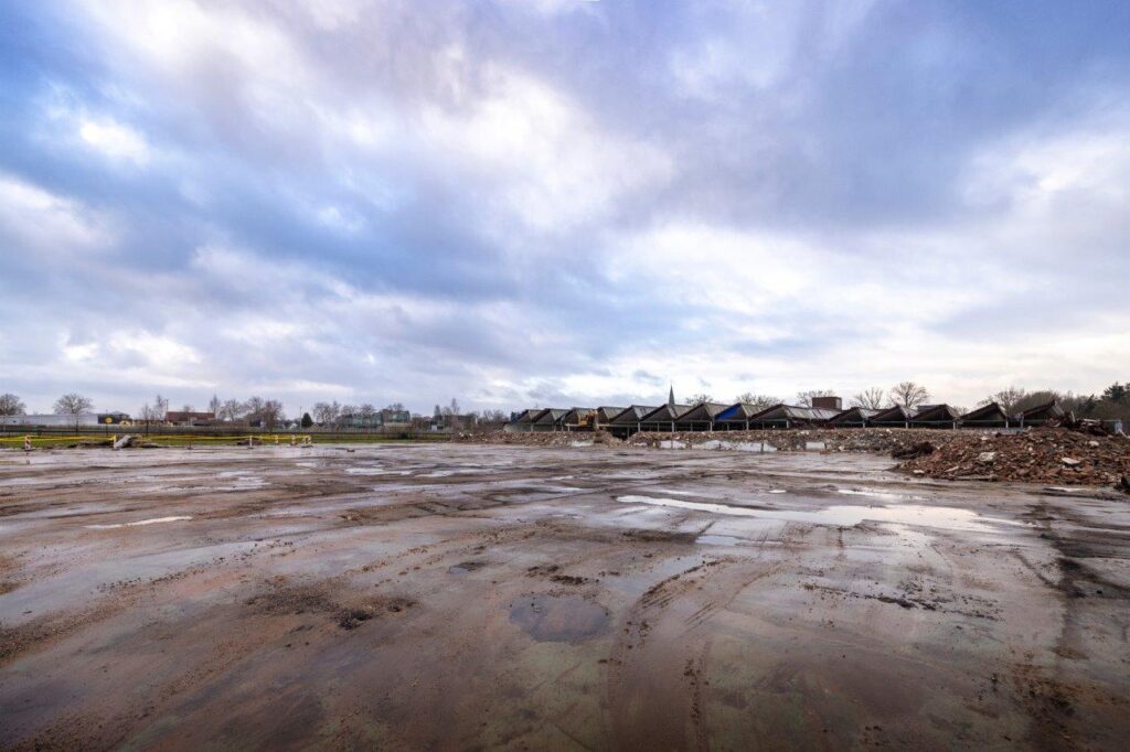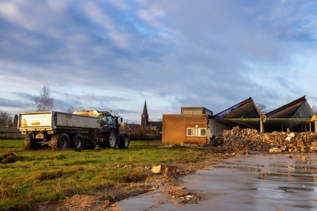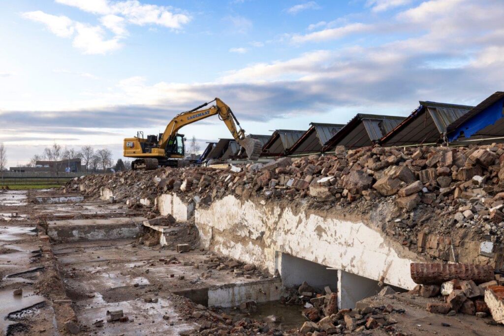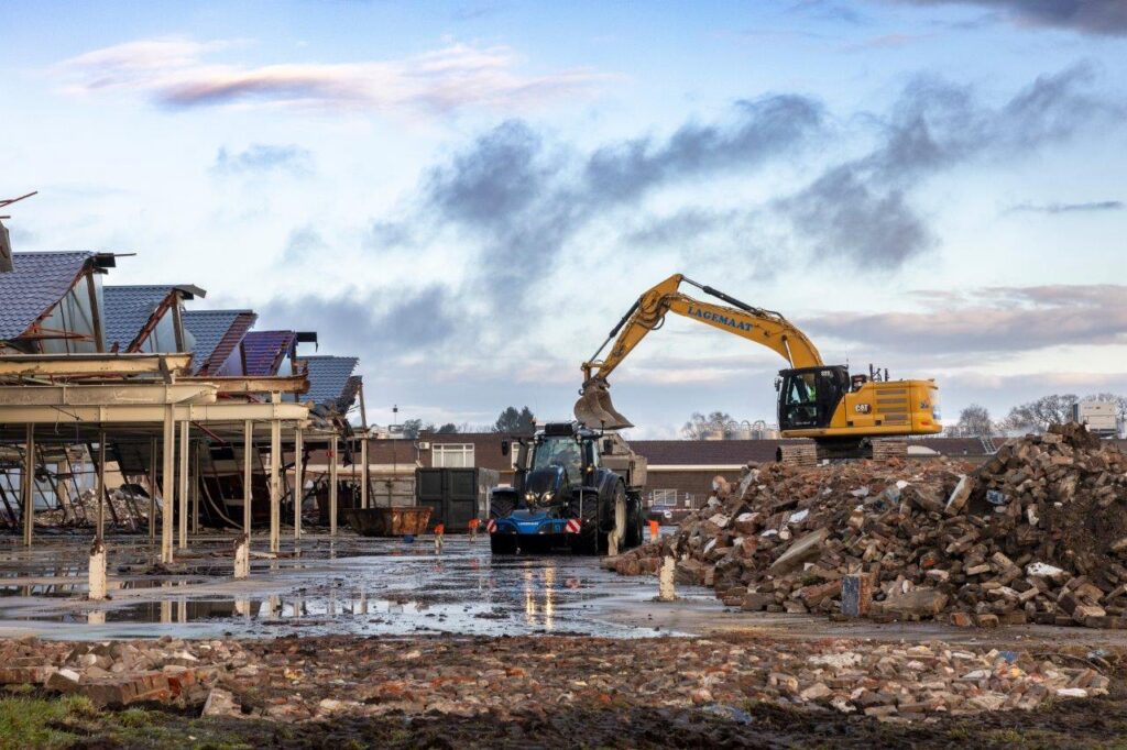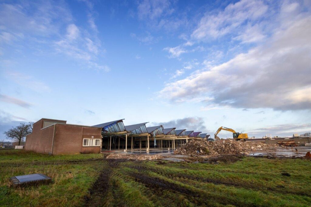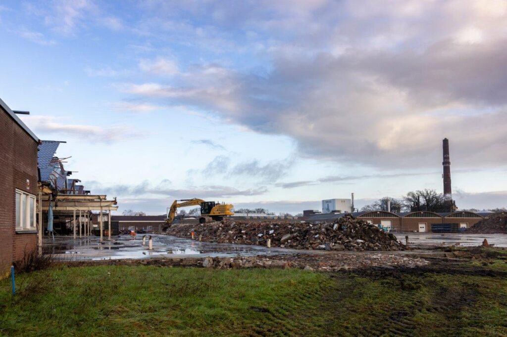De sloopwerkzaamheden op het bedrijventerrein vorderen gestaag. De opbouw van de grote hal is al helemaal verdwenen, alleen de fundering ligt er nog. Die wordt de komende tijd uitgegraven en verwijderd. Om ruimte te maken voor de nieuwe fabriekshal, worden ook de twee gebouwen achter de hal gesloopt.
